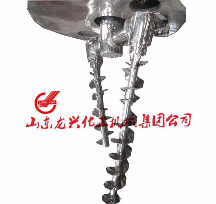 不銹鋼電加熱雙螺旋錐形混合機(jī)筒內(nèi)兩只非對(duì)稱螺旋自轉(zhuǎn)將物料向上提升,轉(zhuǎn)臂慢速公轉(zhuǎn)運(yùn)動(dòng);使螺旋外的物料,不同程度進(jìn)入螺柱,從而達(dá)到全圓周方位物料的不斷更新擴(kuò)散,被提到上部的兩股物料再向中心凹穴匯合,形成一股向下的物料流,補(bǔ)充了底部的空缺,從而形成對(duì)流循環(huán)的三重混合效果;標(biāo)準(zhǔn)型錐形螺旋混合機(jī)有兩根攪拌螺旋,實(shí)際應(yīng)用中根據(jù)設(shè)備規(guī)格大小可以采用單(一根長(zhǎng)螺旋)、雙(長(zhǎng)短各一兩根不對(duì)稱螺旋)、三(兩短一長(zhǎng)對(duì)稱布置)根螺旋;理論上攪拌螺旋越多,混合效果越好;不銹鋼雙螺旋錐形混合機(jī)根據(jù)工藝要求可在混合機(jī)筒體外增加夾套,通過向夾套內(nèi)注入冷熱介質(zhì)來實(shí)現(xiàn)對(duì)物料的冷卻或加熱;冷卻一般泵入工業(yè)用水,加熱可通入蒸汽或電加熱導(dǎo)熱油;設(shè)備一般采用梅花狀“錯(cuò)位閥”,此閥與長(zhǎng)螺旋底部貼合緊密,有效減少混合死角,驅(qū)動(dòng)形式有手動(dòng)和氣動(dòng)可選;夾套可以采用導(dǎo)熱油電加熱或者半圓管式加熱或冷卻等方式。根據(jù)用戶需要,也可加裝蝶閥、球閥、星形卸料器、邊出料等。