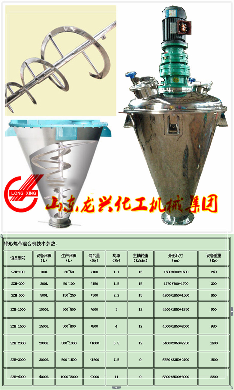 選精品立式錐形螺帶混合機就選山東龍興立式錐形螺帶混合機,購立式錐形螺帶混合機請認準選龍騰牌,謹防假冒!現價格優惠銷售0.1-10立方立式錐形螺帶混合機。