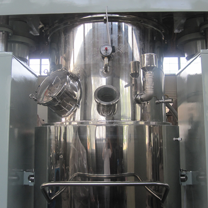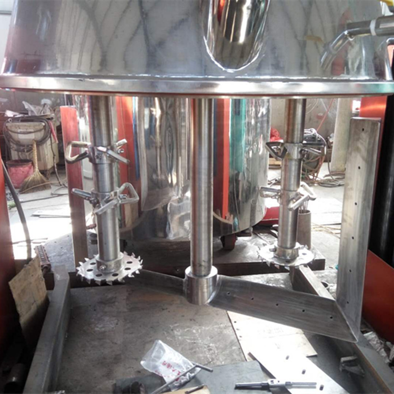 強力分散機有三個電動機,釜內有三根不同形式的攪拌器,其中一個攪拌器在繞釜體軸線轉動,其余兩個攪拌裝置又以不同的轉速,繞自身軸線高速自轉,使物料在釜內作復雜的運動,受到強烈的剪切和搓合。機器設備內山形刮刀繞釜體軸線轉動,將粘在壁上和底部的原料刮出,使其效果更為理想。設備密封性好,可抽真空,具有良好的排氣除泡效果。設備缸蓋可液壓升降,缸體可自由移動,操作十分方便。攪拌器的形式,根據物料要求可為多層槳葉式、框式、蝴蝶式、葉輪式等。通常采用變頻調速,以滿足各種工藝要求。
